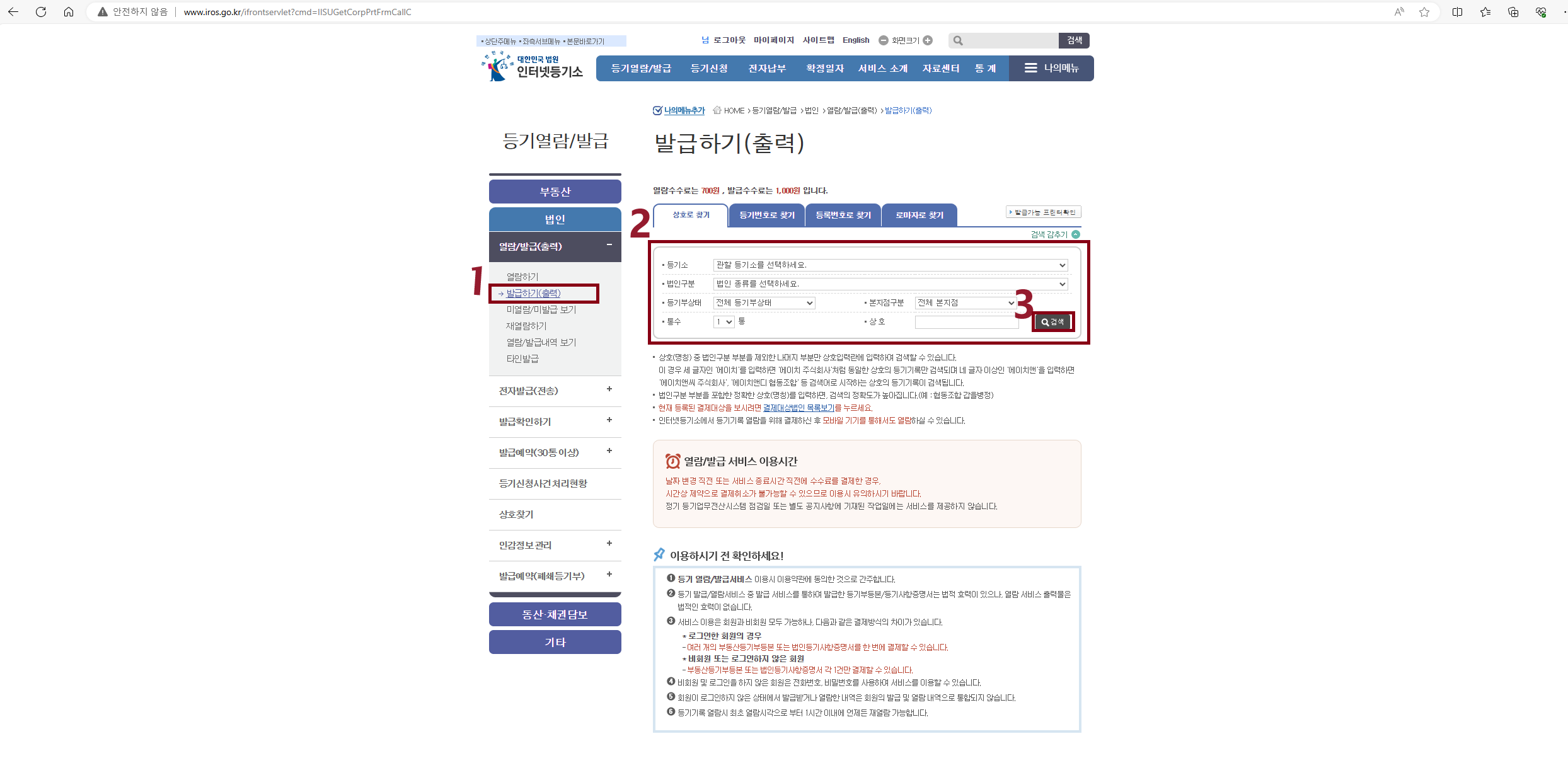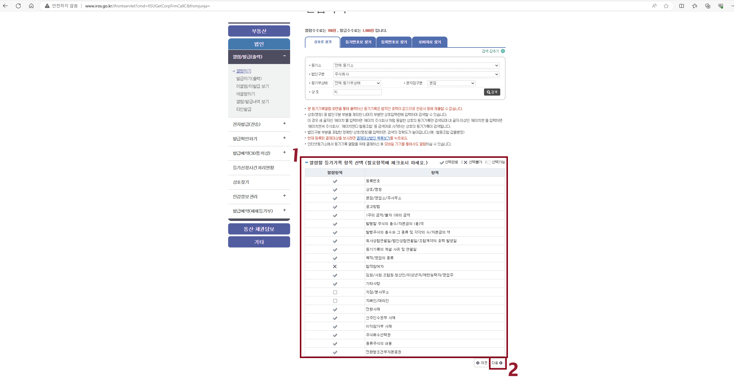 상호/등기번호/등록번호/로마자 중에 원하는 검색 방법을 선택하고서 하나씩 정보 입력해서 검색해주시면 됩니다.