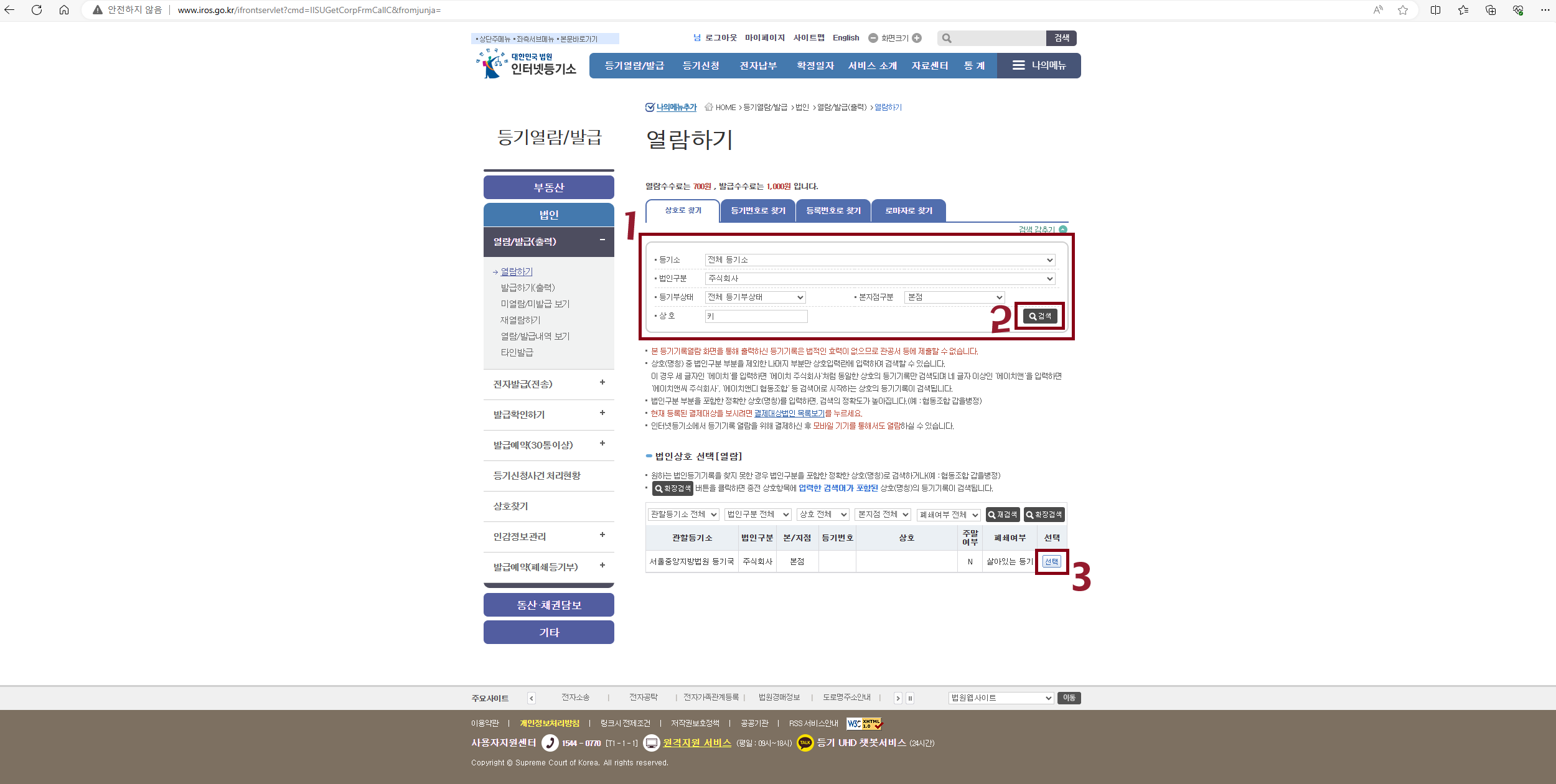 상호/등기번호/등록번호/로마자 중에 어떤 정보로 찾을 건지 선택해주시면 되는데요.