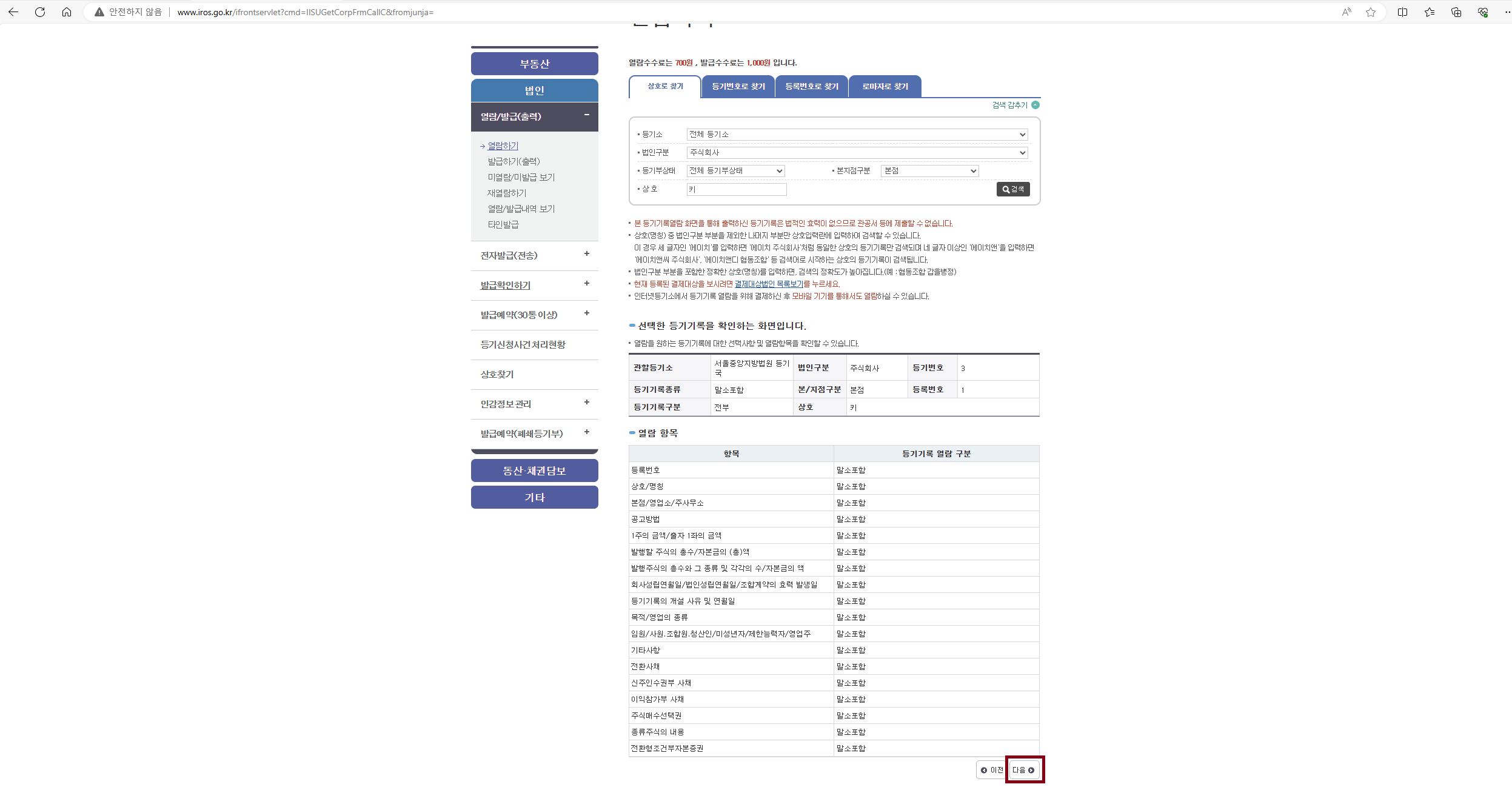 10. 열람할 등기기록 항목 선택 후에 [다음] 클릭하기