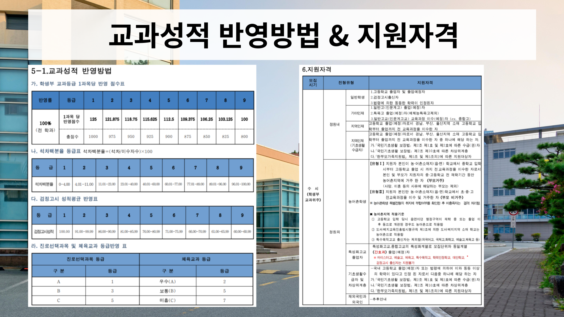 그 외에도 석차백분율, 검정고시 반영 기준, 진로선택 과목 및 체육교과 등급반영에 대한 내용도 꼭 확인해주세요.