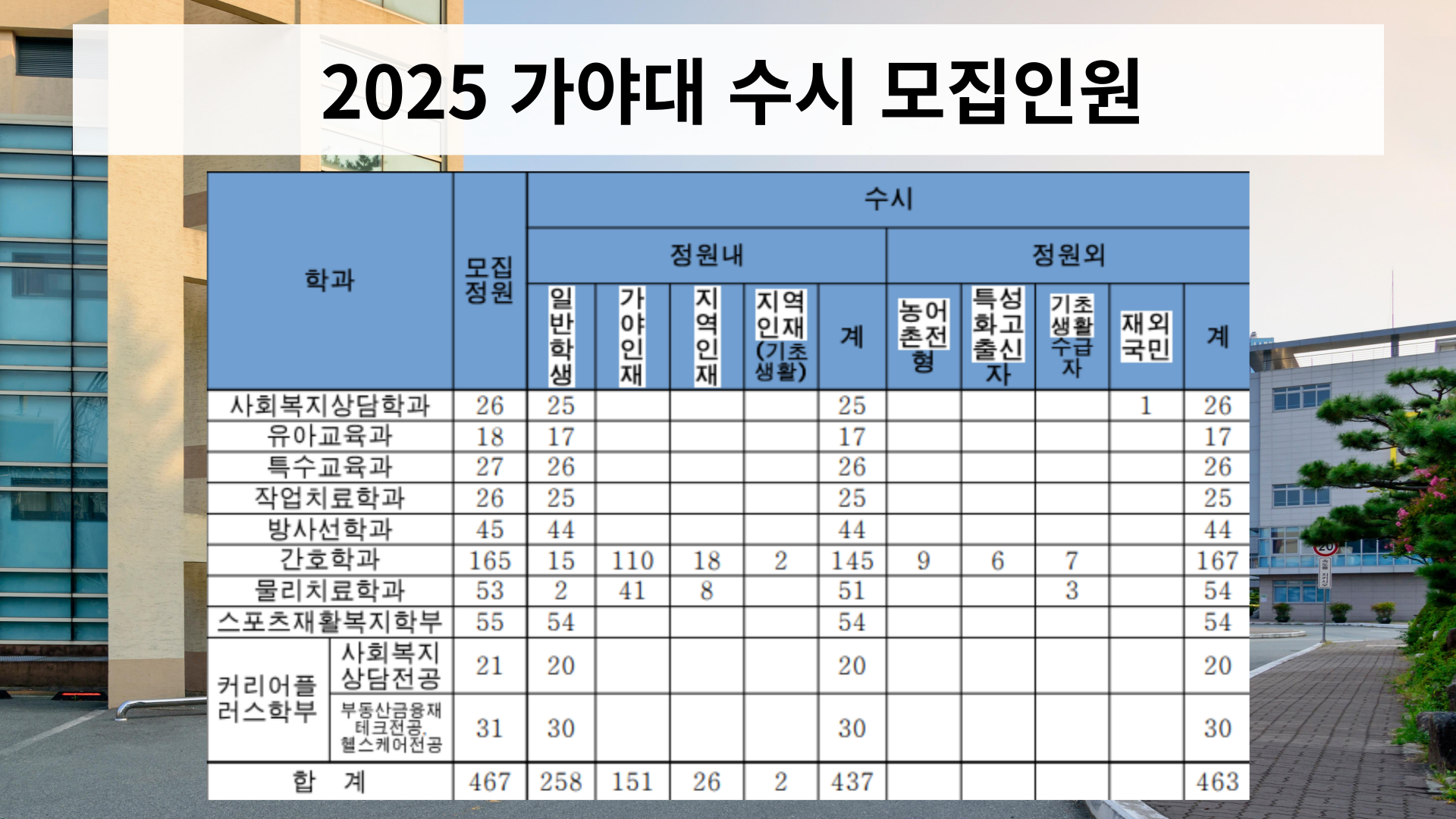 2025학년도에는 가야대 수시에서 총 463명을 모집한다고 합니다.