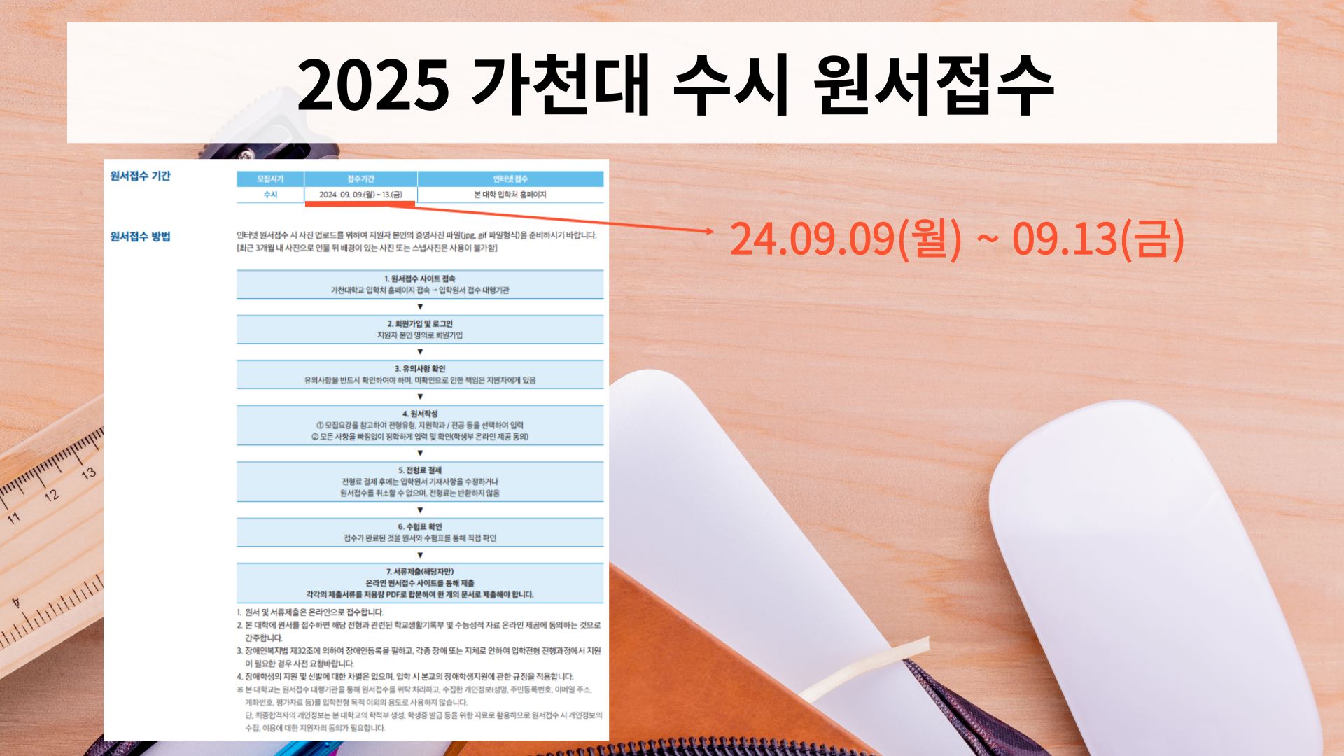 2025학년도 가천대 수시 원서접수 일정은 '24.09.09(월) ~ 09.13(금)'입니다.
