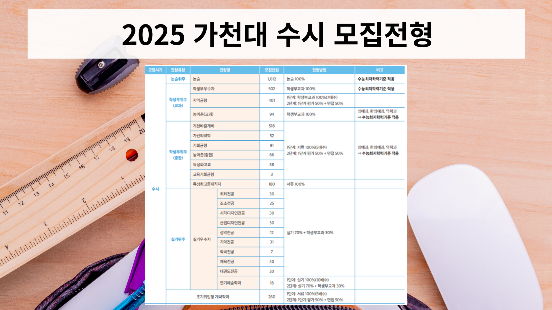 일부 전형에서는 '수능최저학력기준'이 적용되기 때문에 이 부분까지 고려해서 준비하셔야 되겠습니다.
