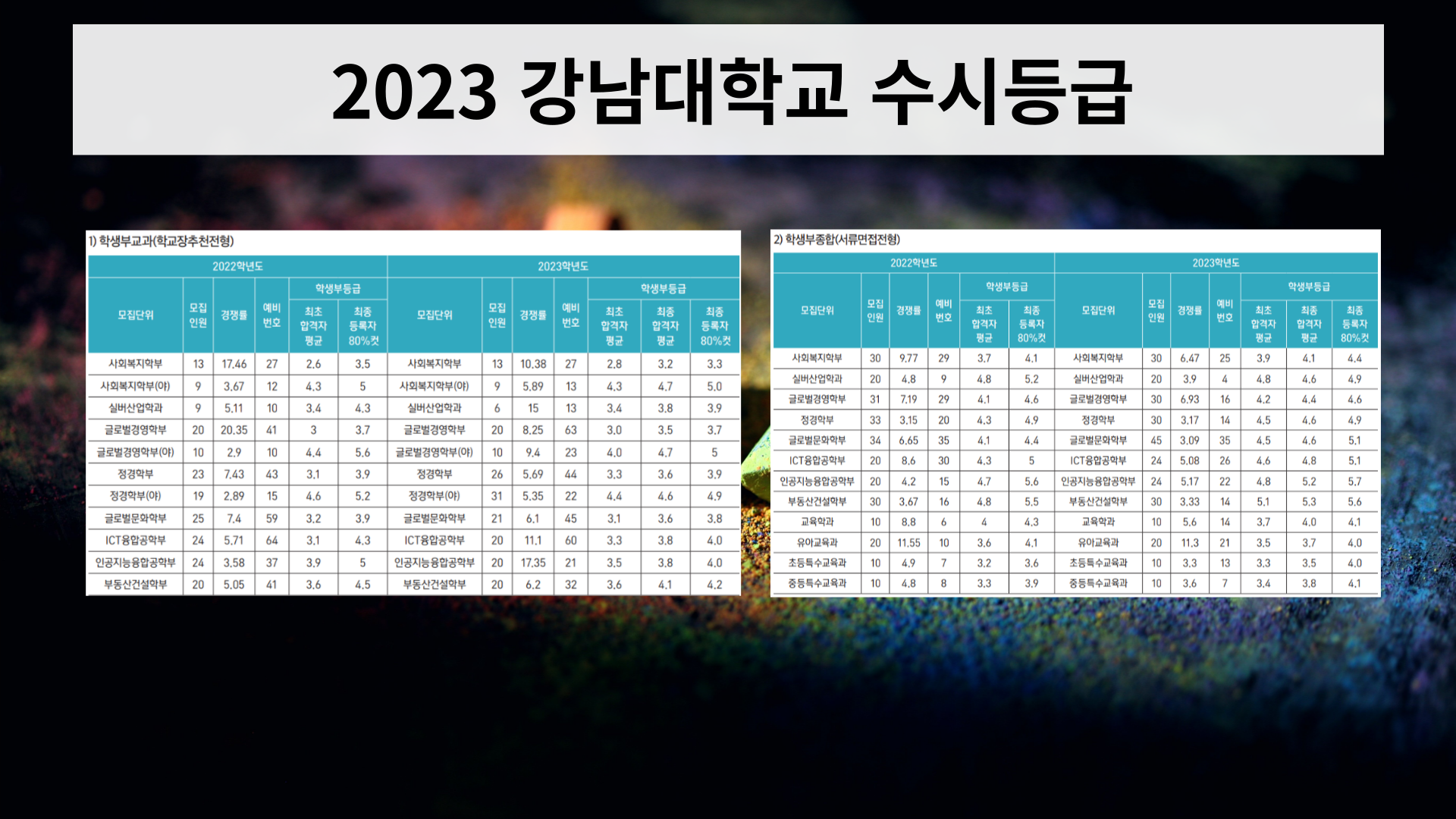 마지막으로, 2023학년도 강남대학교 수시등급컷 소개해드리도록 하겠습니다.